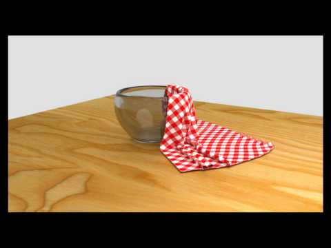 One of the highlights is the application of materials: the glass bowl’s shader includes transparency, reflection, and refraction properties, essential for realistic glass rendering. The cloth napkin features texture and bump mapping to simulate fabric texture.
